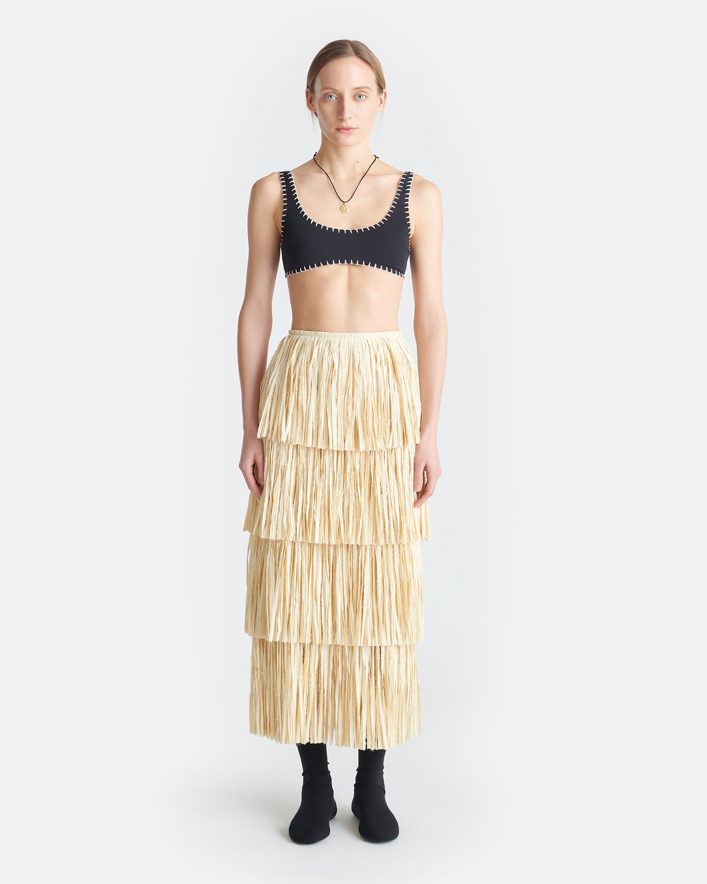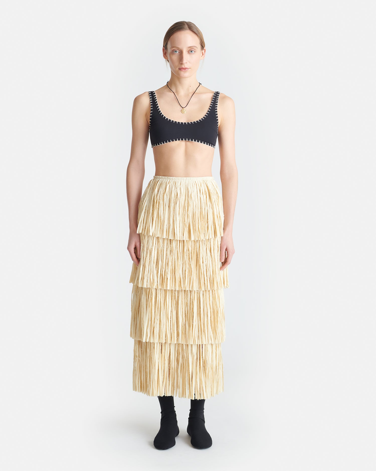 Inspired by antique paper craft, we layered deadstock fabrics to make dense fringing a key feature of our Spring/Summer 2025 collection. A standout piece, the Lynelle midi skirt has panels of poplin fringing that swish beautifully with every step.