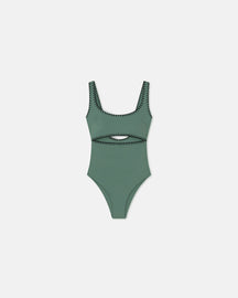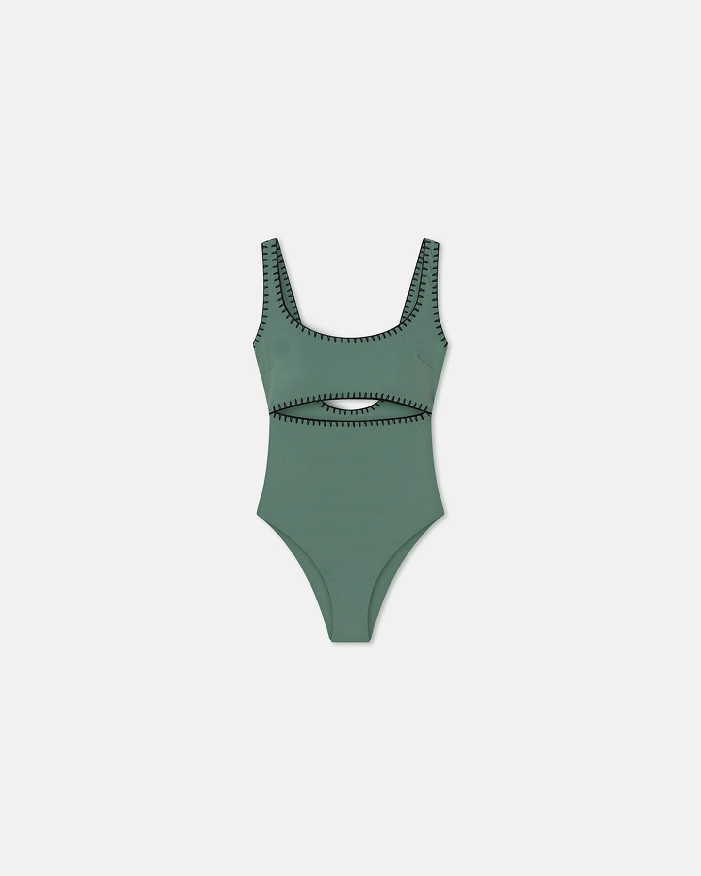 Unmistakably Nanushka, the Sorena swimsuit has a sleek square neckline and cut-out front framed by contrasting creme blanket stitches. It is made from recycled nylon to smooth, sculpt and support your frame.