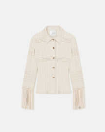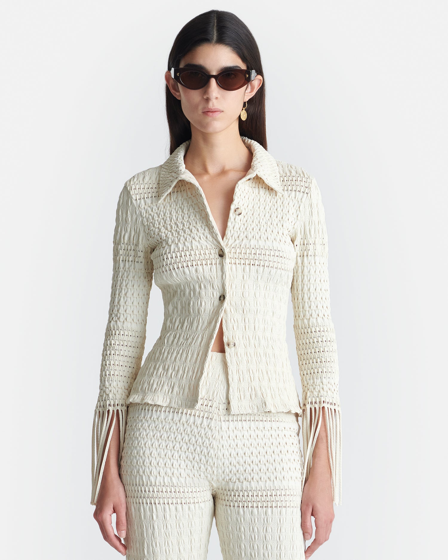 Fringing is one of the defining features of our Spring/Summer 2025 collection, inspired by a book on antique papercraft. Woven from seersucker, the creme Niceta shirt has a wave of tassels that brush the wrist.