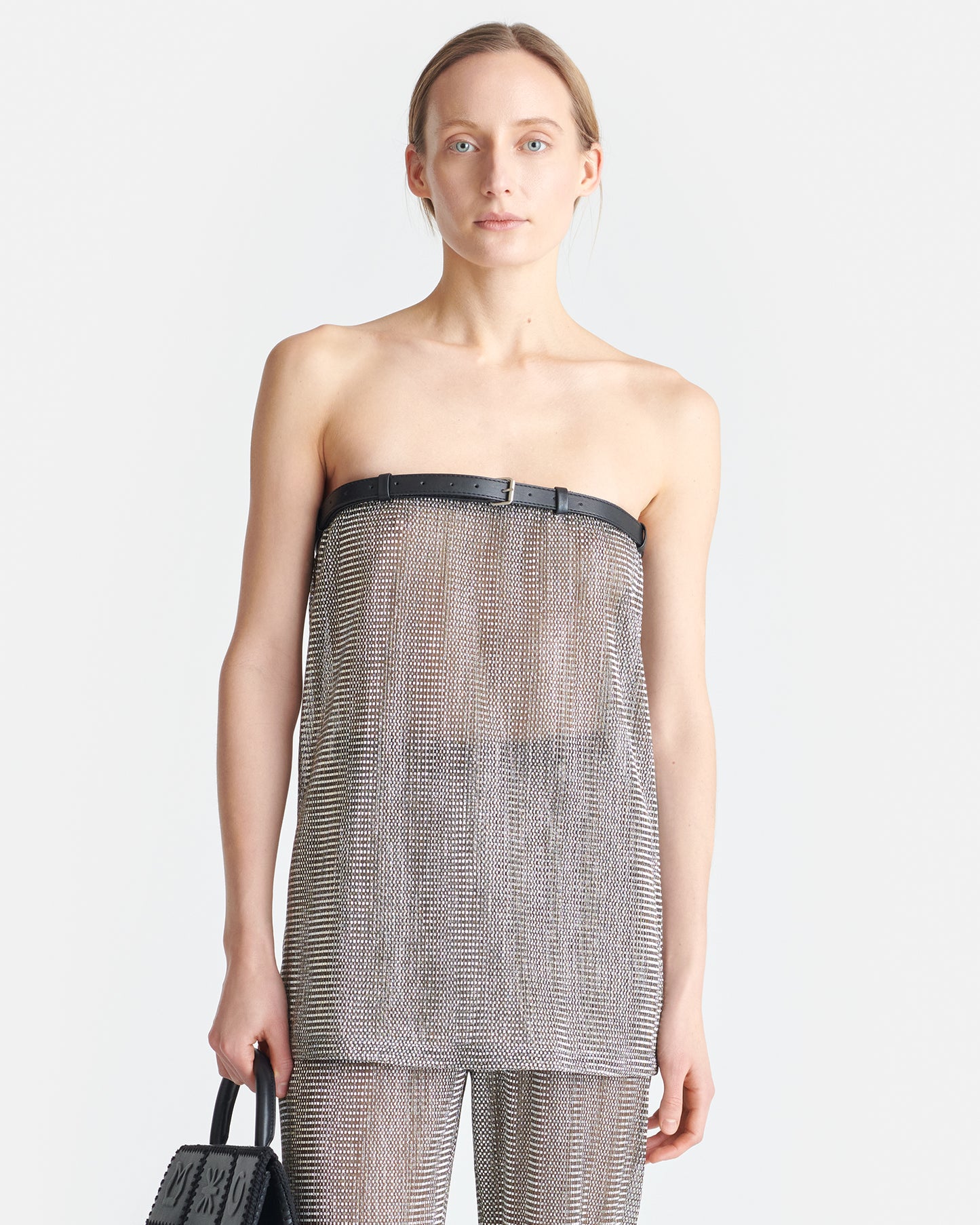 Unexpected details are a Nanushka signature. The Gilma top is made from a shimmering version of our pleated fabric and topped with a regenerated leather belt. Wear yours for evening with the matching Maglie pants.