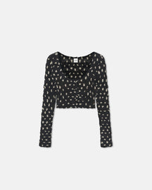 The Jylan top is made of polka-dotted seersucker tech chiffon, our new, textured fabrication for Spring/Summer 2025. The cropped cut works perfectly with low-rise silhouettes.