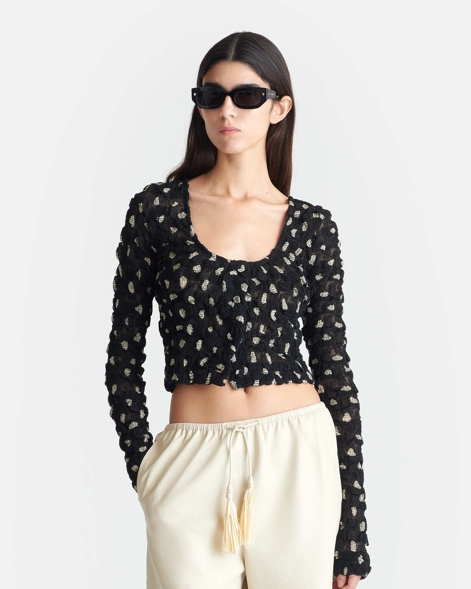 The Jylan top is made of polka-dotted seersucker tech chiffon, our new, textured fabrication for Spring/Summer 2025. The cropped cut works perfectly with low-rise silhouettes.