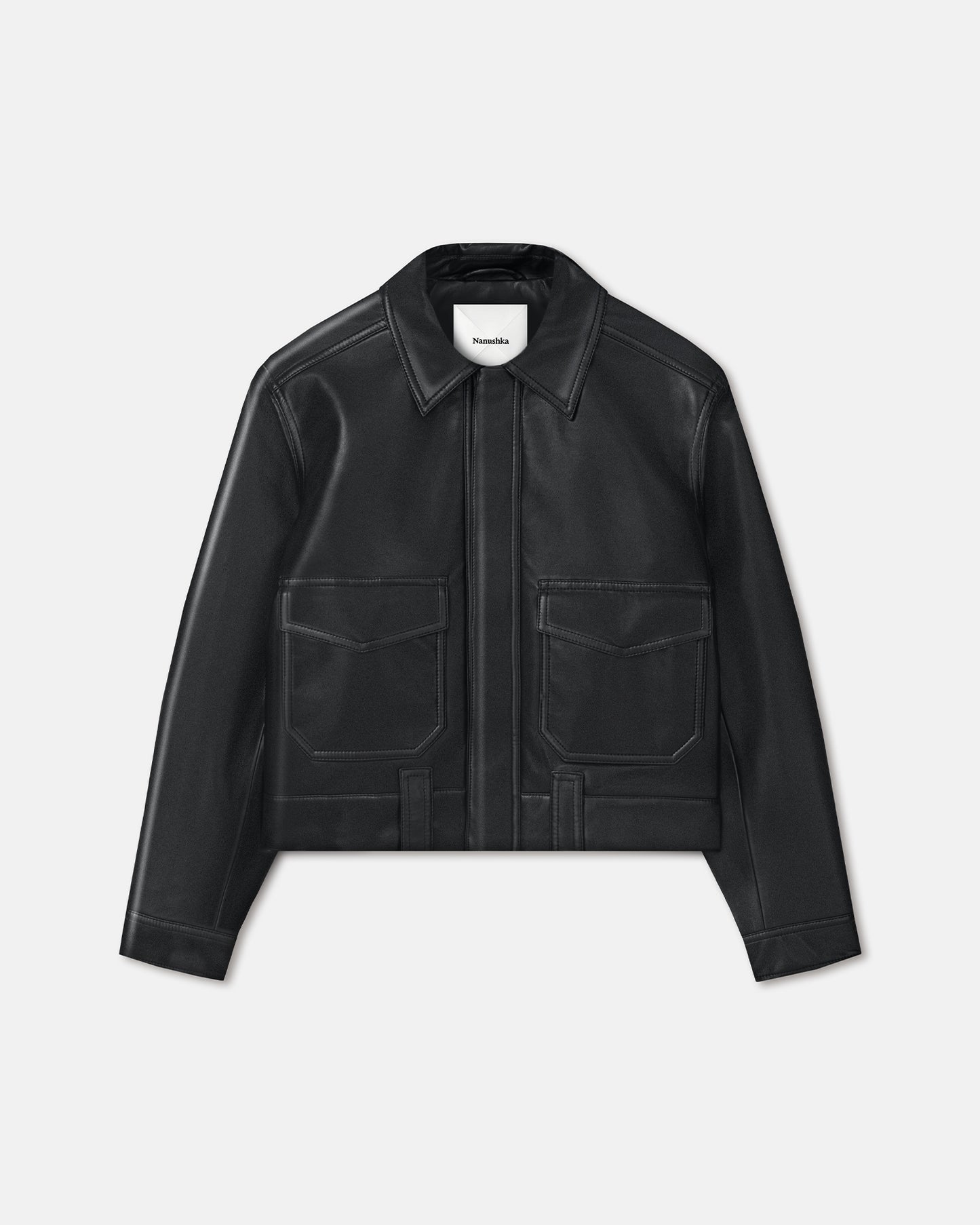 The Ruben jacket is made to endure. Crafted from hard-wearing regenerated leather in a classic black tone, it is minimally detailed to evoke classic flight styles – a cropped cut, capacious flap pockets, and button fastenings.
